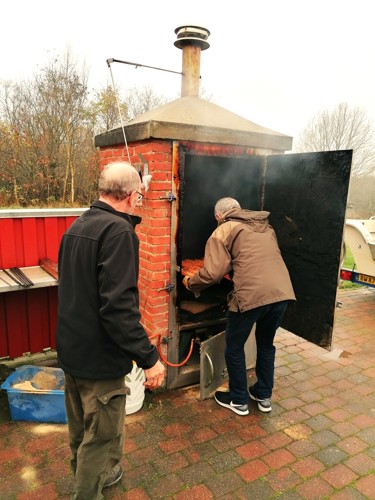 Erik Nielsen, Vagn Kristensen og Jan Lykkegaard varmrøger fisk i Varde Sportsfiskerforenings røgeovn.